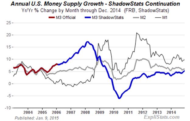 Money Supply M3 Annual Growth Tentatively Rose to 5.2% in December. Year-to-year change in December 2014 M3 (ShadowStats Ongoing Measure) jumped to 5.2%, from a revised 4.8% (previously 4.7% in November. Prior-period revisions were due to regular and frequent revisions of the underlying detail provided by the Federal Reserve.
