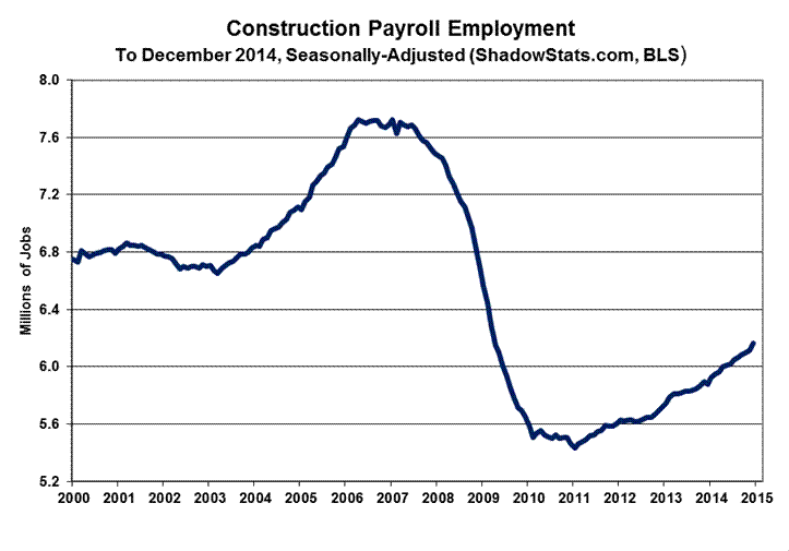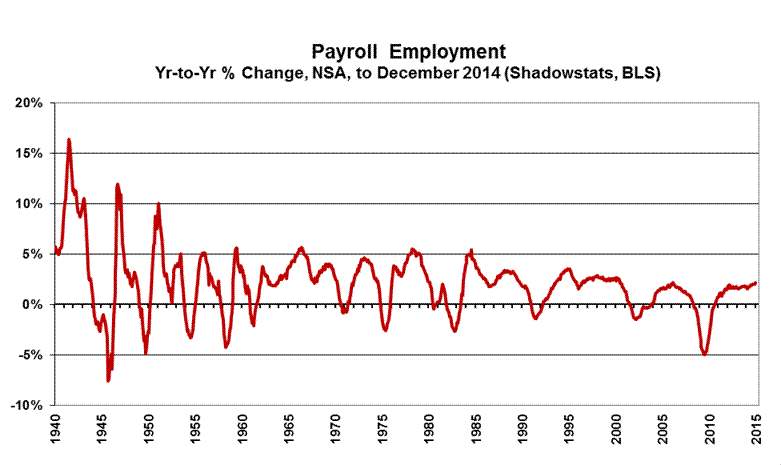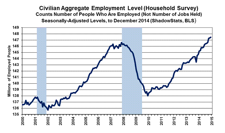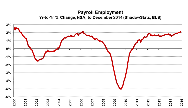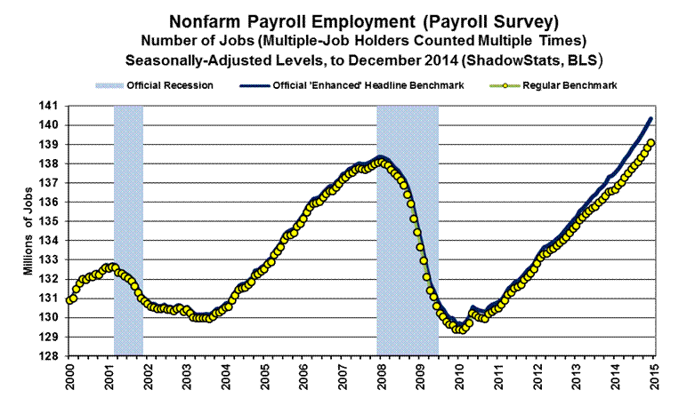 “Trend Model” Estimate Subject to Vagaries of Upcoming Payroll Benchmarking. As discussed in Commentary No. 679, and as described generally in Payroll Trends, the trend indication from the BLS’s concurrent-seasonal-adjustment model—prepared by our affiliate www.ExpliStats.com—was for a December 2014 monthly payroll gain of 214,000, based on the BLS trend model structured into November’s actual reporting. The late-consensus for December 2014 reporting was 245,000 (Bloomberg), where the headline gain came in at 252,000, slightly above consensus well above trend. Full detail on the headline payroll data, including various drill-down and graphics options are available to ShadowStats subscribers at ShadowStats-affiliate www.ExpliStats.com.
