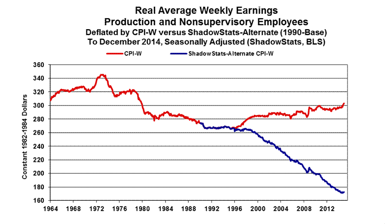 In the preceding graph of this series, the earnings as officially deflated by the BLS using the CPI-W are shown with the red-line, and as adjusted for the ShadowStats-Alternate CPI Measure, 1990-Base, with the blue-line. When inflation-depressing methodologies of the 1990s began to kick-in, the artificially-weakened CPI-W (also used in calculating Social Security cost-of-living adjustments) helped to prop up the reported real earnings. Official real earnings today still have not recovered their inflation-adjusted levels of the early-1970s, and, at best, have been flat for the last decade. Deflated by the ShadowStats measure, real earnings have been in fairly-regular decline for the last four decades, which is much closer to common experience than the pattern suggested by the CPI-W. See Public Commentary on Inflation Measurement for further detail.