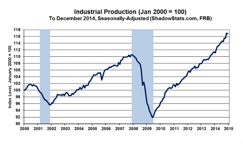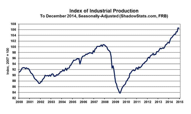 Production Graphs. The following two sets of graphs reflect headline industrial production activity to date. The first graph in the first set shows the monthly level of the production index, with November 2014 having setting an historic high level for the series, before the small decline in December. The second graph shows the year-to-year percentage change in the same series for recent historical detail, beginning January 2000. The second set of graphs shows the same data in historical context since World War II.