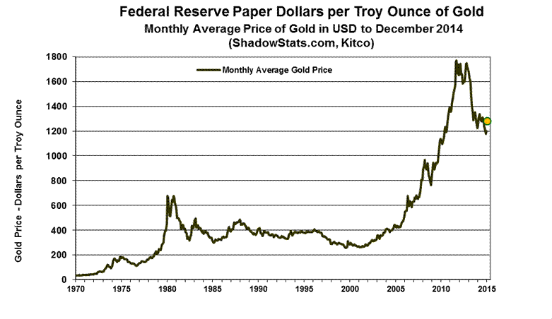 In like manner, the all-time high nominal price for silver in January 1980 of $49.45 per troy ounce (London afternoon fix, per silverinstitute.org)—although approached in 2011—still has not been hit since 1980, including in terms of inflation-adjusted dollars. Based on December 2014 CPI-U inflation, the 1980 silver-price peak would be $149 per troy ounce and would be $661 per troy ounce in terms of December 2014 ShadowStats-Alternate-CPI (1980-Base) adjusted dollars (again, all series not seasonally adjusted).