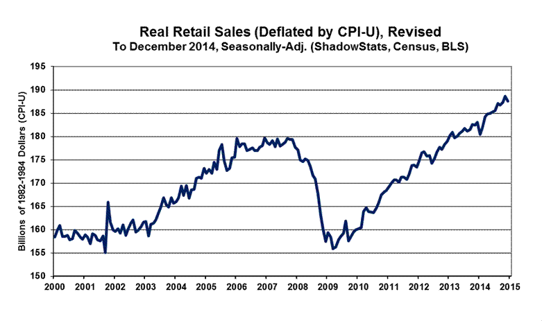 Corrected Real Retail Sales—December 2014. The apparent “recovery” in the headline real retail sales generally has continued, although the headline reporting slowed recently, turning down in December 2014. Nonetheless, headline real growth in retail sales continues to be overstated heavily, due to the understatement of the rate of inflation used in deflating the retail sales series. As discussed more fully in Chapter 9 of 2014 Hyperinflation Report—Great Economic Tumble – Second Installment, deflation by too-low an inflation number (such as the CPI-U) results in the deflated series overstating inflation-adjusted economic growth.