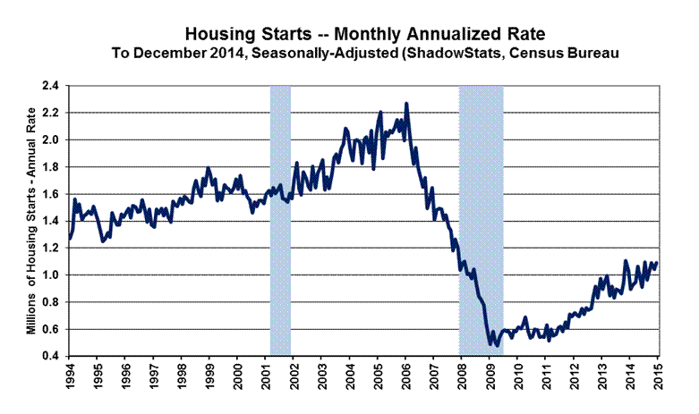 Today’s Missive (January 21st). Beyond the Opening Comments on economic reality, today’s (January 21st) Commentary concentrates on the detail from the December 2014 reporting of residential construction – housing starts. The Week Ahead section previews the reporting of December new orders for durable goods, new- and existing-home sales and the "advance" estimate of fourth-quarter 2014 GDP. It is not likely that the initial fourth-quarter 2014 GDP estimate would contradict the President’s claim, last night, of strong growth in current economic activity.