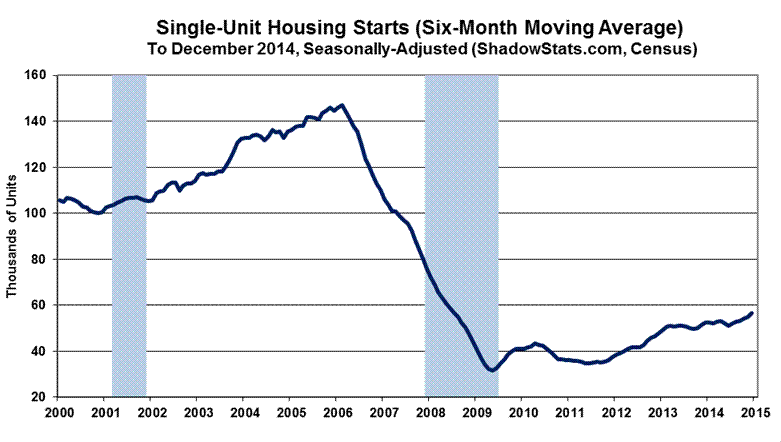 Housing starts for single-unit structures in December rose month-to-month by a statistically-insignificant 7.2% +/- 12.4%, following a revised decline of 5.2% (-5.2%) [previously down by 5.4% (-5.4%)] in November, and an unrevised 8.0% [initially 4.2%] gain in October. A statistically-insignificant December 2014 year-to-year gain of 7.9% +/- 14.5%, followed a revised decline of 4.4% (-4.4%) [previously down by 4.6% (-4.6%)] in November, and an unrevised 18.7% [initially 15.4%] gain in October.