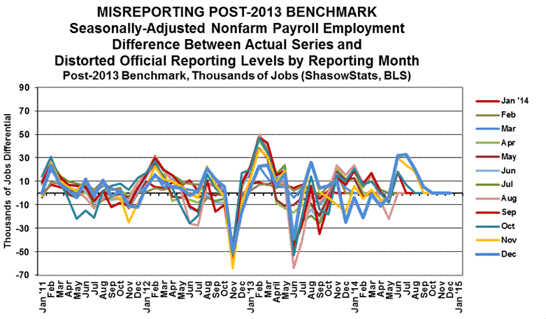 The preceding graphs show how far the monthly payroll employment data strayed from being consistent. The first graph shows the monthly distortions through December 2014 reporting, versus the 2013-benchmark revision to the series in February 2014.