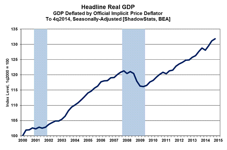 ShadowStats-Alternate GDP. The ShadowStats-Alternate GDP estimate for fourth-quarter 2014 GDP was a year-to-year contraction of 1.6% (-1.6%) versus the revised headline fourth-quarter GDP gain of 2.4% (previously 2.5%). Those fourth-quarter 2014 estimates were against a ShadowStats estimated 1.7% (-1.7%) year-to-year contraction and a headline year-to-year gain of 2.7% in third-quarter 2014 GDP (see the Alternate Data tab).