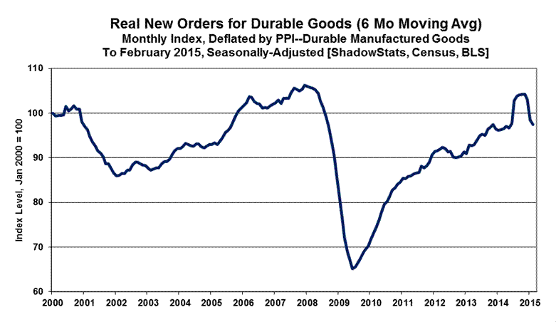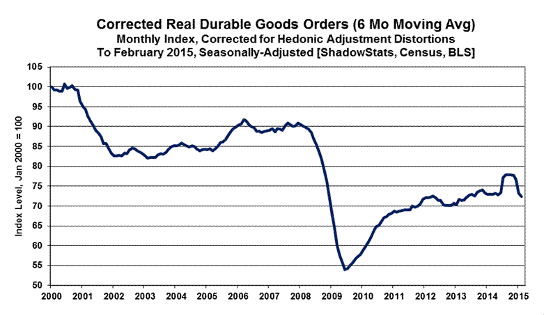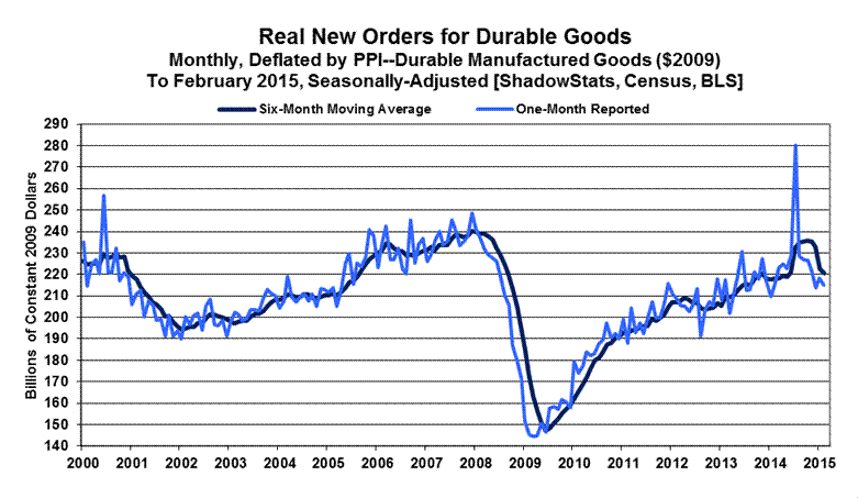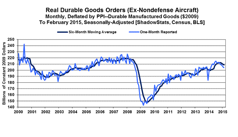 Real (Inflation-Adjusted) Durable Goods Orders—February 2015. ShadowStats uses the PPI aggregated inflation measure "Durable Manufactured Goods" for deflating the new orders for durable goods series. Published only on a not-seasonally-adjusted basis, the related PPI series reflected a headline "unchanged" pace of inflation in February 2015, for a third month, the same as in January and December, with headline annual inflation at 0.60% in February 2015, versus 0.72% in January 2015, and 1.09% in December 2014.