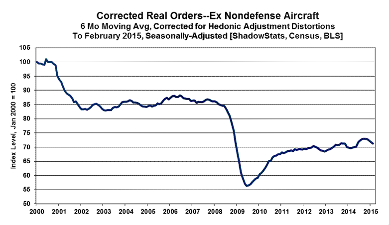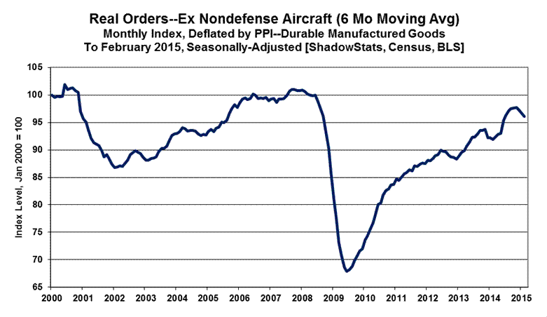 In terms of inflation-adjusted activity, both of these series have shown a slowing uptrend and flattening-out in the last two-to-three years—with a dip and upside bouncing into 2013, and renewed stagnation, feeding into the temporary July 2014 surge, with orders in general decline since third-quarter 2014. Broadly, there has been a recent general pattern of down-trending stagnation or bottom-bouncing evident in the orders—clearly not the booming recovery that has been seen in official GDP reporting. The real (inflation-adjusted) monthly and six-month moving-average level of new orders in February 2015 was below the pre-2007 recession high, as well as below the pre-2000 recession high. The pattern of recent stagnation now having turned to a downtrend in the inflation-adjusted series—net of the irregular aircraft-order effects—is one that commonly precedes or is coincident with a recession.