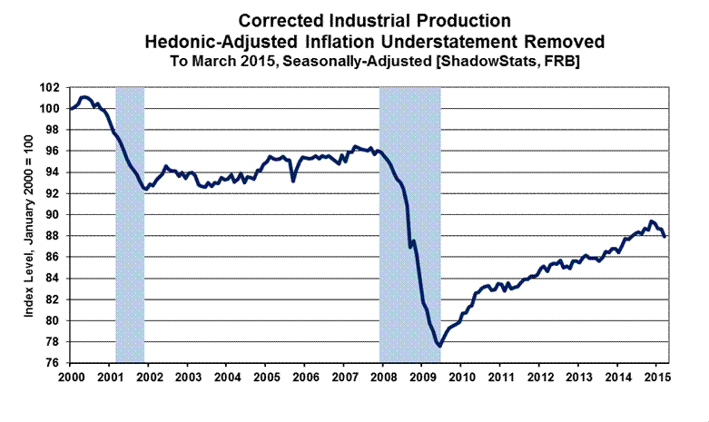 Hedonic quality adjustments to inflation understate the inflation used in deflating some components of the index of industrial production. That has the effect of overstating the resulting inflation-adjusted growth in the headline industrial production series (see Public Comment on Inflation and the Chapter 9 of 2014 Hyperinflation Report—Great Economic Tumble).