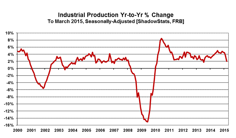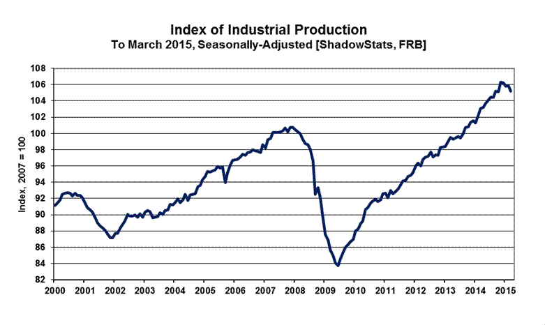 Index of Industrial Production—March 2015—First Quarterly Decline Since Formal Trough of Economic Collapse. Reflecting plunging oil and gas production and declining manufacturing, first-quarter 2015 industrial production fell at an annualized pace of 1.0% (-1.0%) [down by 0.97% (-0.97%) at the second decimal point].
