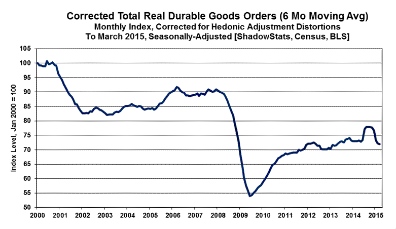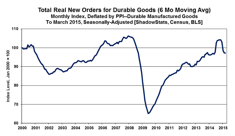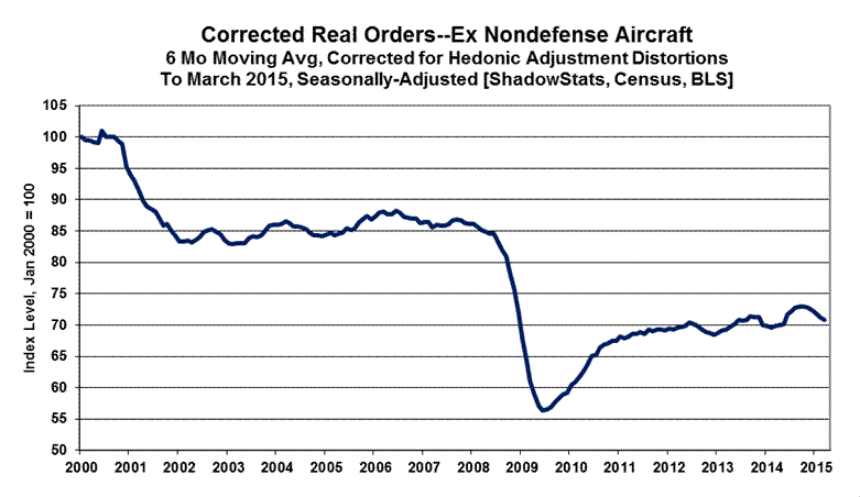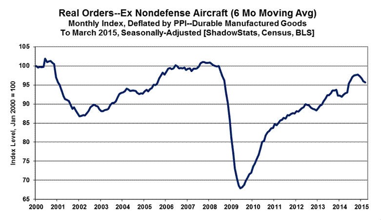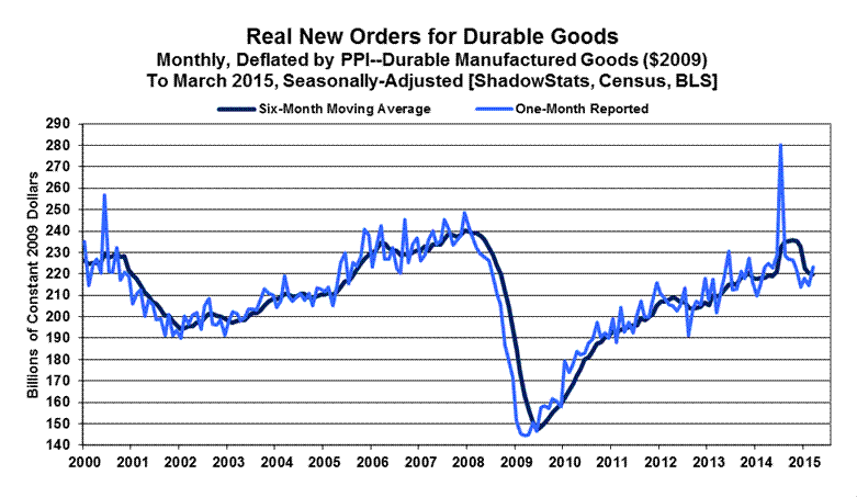 As usually assessed by ShadowStats, with the just the impact of commercial-aircraft orders removed, the March 2015 headline monthly increase of 4.0% slowed to 2.5%, following four straight months of month-to-month contractions, which set the stage for the back-to-back quarterly downturns in new orders. Net of inflation and ex-commercial aircraft orders, new orders for durable goods, rose at an annualized quarterly pace of 4.30% in third-quarter 2014, contracted at an annualized pace of 5.53% (-5.53%) in fourth-quarter 2014 and now have turned down at an annualized pace of 7.77% (-7.77%) in first-quarter 2015.