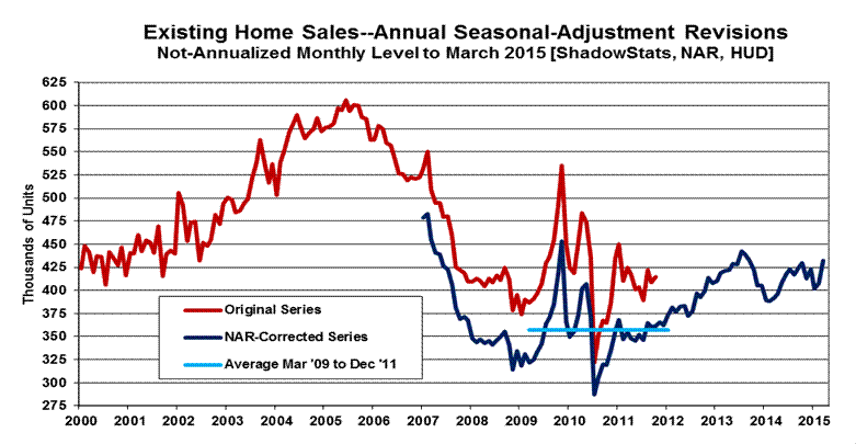 Home Sales—March 2015—Residential Real Estate Activity Continued in Unstable but Generally Negative-to-Stagnant Broad Patterns of Activity. Existing-home sales increased by a stronger-than-expected 6.1% month-to-month gain in March 2015 [consensus was for a 3.4% gain per Bloomberg], but the series remained in near-term downtrend, with a first-quarter 2015 quarterly contraction. March 2015 new-home sales fell by a worse-than-expected 11.4% (-11.4%) [Bloomberg consensus was for a decline of 3.9% (-3.9%)], but the highly unstable series continued a pattern of low-level, general stagnation in the six-month moving average, to the extent there was any meaning to the reporting.