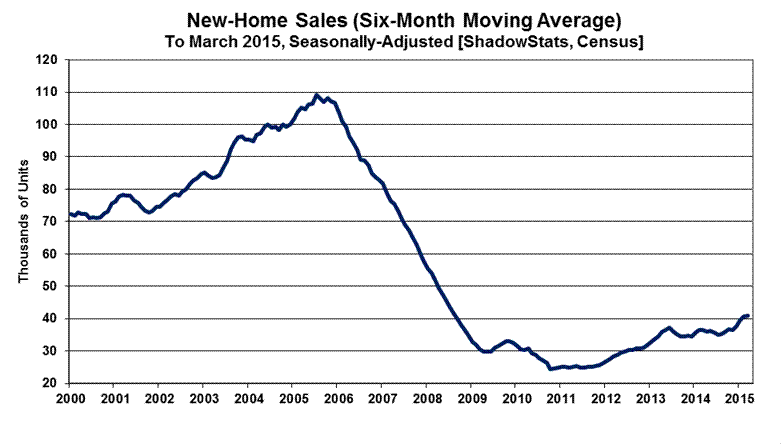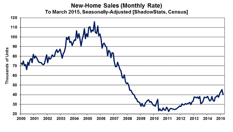 New-Home Sales—March 2015— Unstable Headline Reporting Continued to Suggest Low-Level Sales Stagnation. Headline new-home sales reporting remained worthless. Although March 2015 sales fell by 11.4% (-11.4%) month-to-month, and rose by 19.4% year-to-year, neither of those headline numbers was statistically significant. The best that can be said for this otherwise meaningless monthly series is that the smoothed, six-month moving average continued to show a broad pattern of low-level general stagnation.