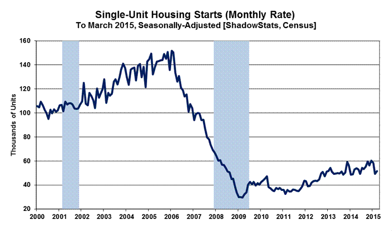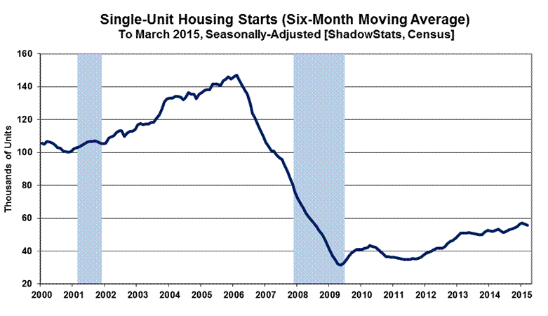 Graphed either way, the various housing series generally continued to show a pattern of economic activity plunging from 2005 or 2006 into 2009, and then stagnation, with the stagnation continuing at a low level of activity to date. Housing never recovered with the purported GDP recovery. Headline March 2015 new-home sales activity still was down by 65.3% (-65.3%) from the pre-recession peak of July 2005 for the series, while March 2015 single-unit housing starts were down by 66.0% (-66.0%) from the January 2006 high of that series.