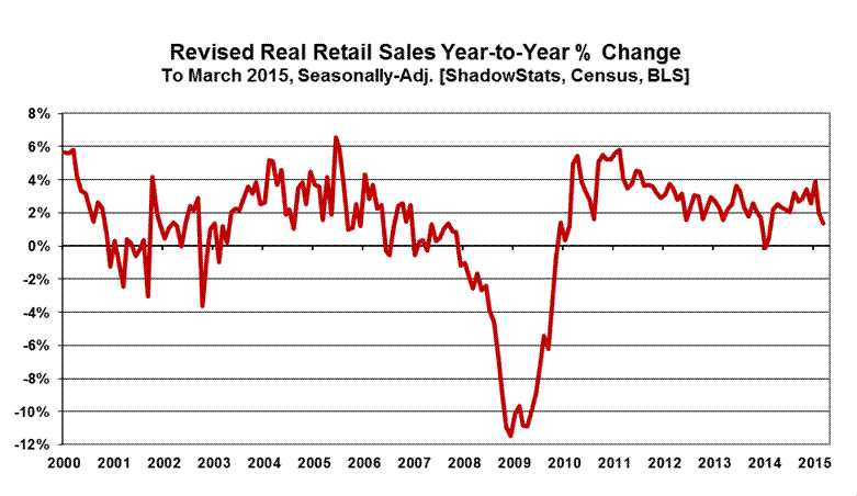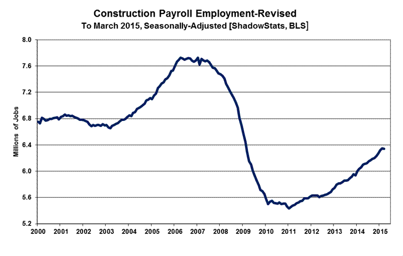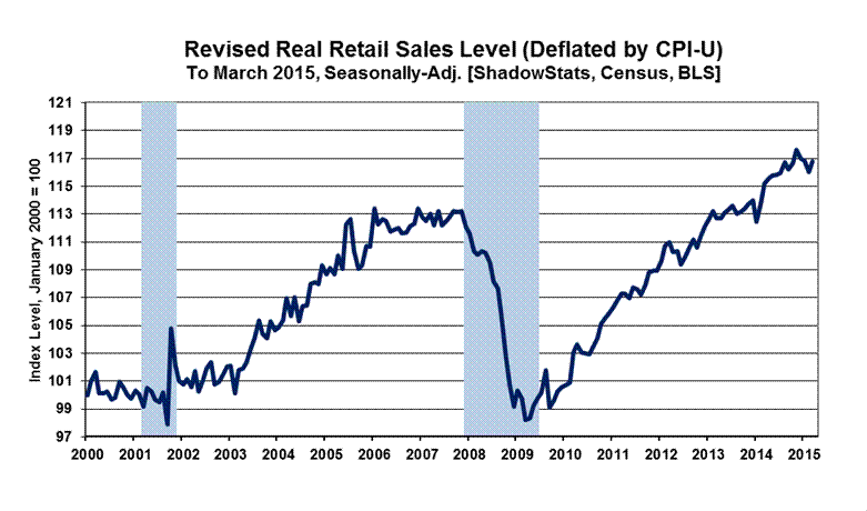 Monthly Payroll Bias Is Above Expectations. As published previously by ShadowStats-affiliate www.ExpliStats.com, in its analysis of the biases built into the concurrent-seasonal-factor modeling of the headline March 2015 payroll employment, the implied built-in bias trend for April 2015 is for a headline jobs gain of 237,000 (see Commentary No. 710). Late market expectations appear to have softened some, now running below trend at 220,000 [Bloomberg].