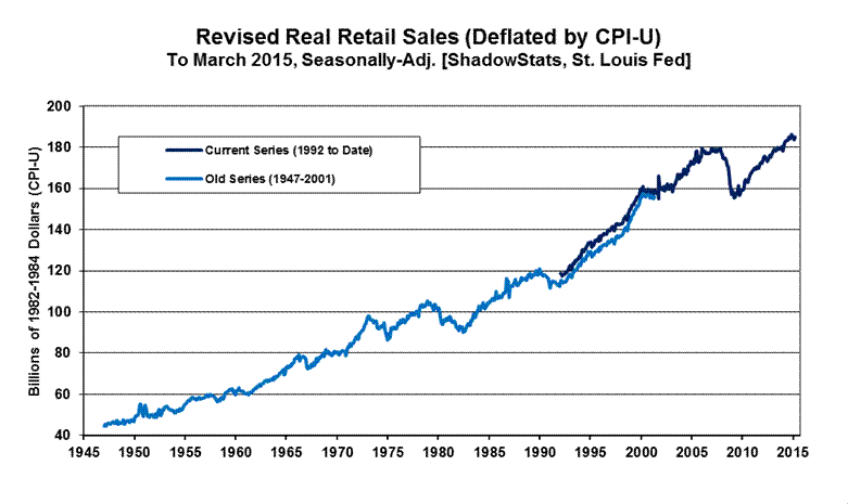 The first three graphs are different versions of the monthly level of retail sales, where the first and third graphs show the series deflated by the CPI-U for varying historical timeframes. The second graph is the real retail sales series as corrected by ShadowStats for the understatement of the CPI series used in deflating the headline numbers. See Commentary No. 713 for extend description and detail.