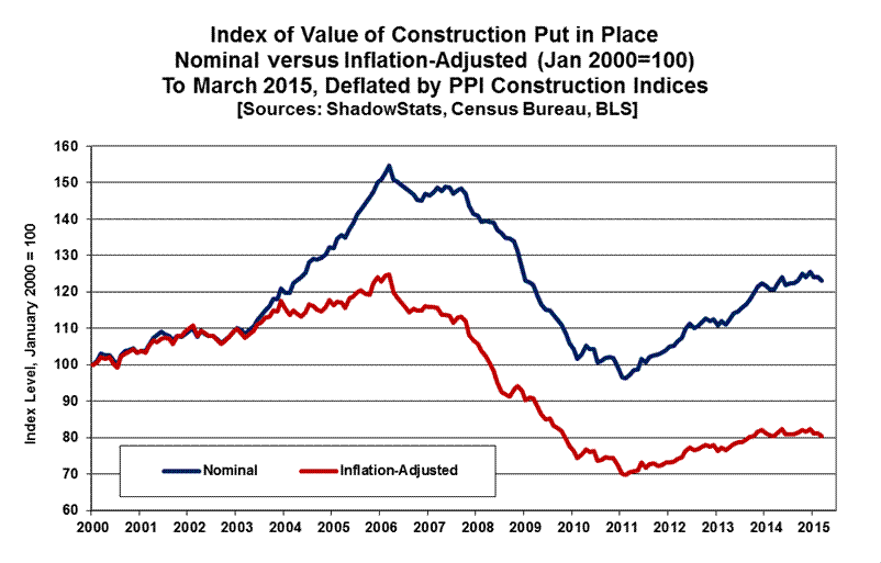 Construction and Related Graphs. The preceding two graphs reflect total construction spending through March 2015, both in the headline nominal dollar terms, and in real terms, after inflation adjustment. The inflation-adjusted graph is on an index basis, with January 2000 = 100.0. Adjusted for the PPI’s NCI measure through October 2009 and the PPI’s Final Demand Construction Index thereafter, real construction spending showed the economy slowing in 2006, plunging into 2011, then turning minimally higher in an environment of low-level stagnation, trending flat since late-2013, and notching lower in the most-recent headline reporting