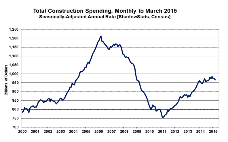 Given full first-quarter 2015 reporting, real construction spending fell at an annualized quarterly pace of 5.3% (-5.3%), versus an annualized quarterly gain of 4.9% in fourth-quarter 2014. Presently at, or near, the recent low of the down-trending pattern of stagnation, the real construction spending series stood 35.5% below its pre-recession high of March 2006.