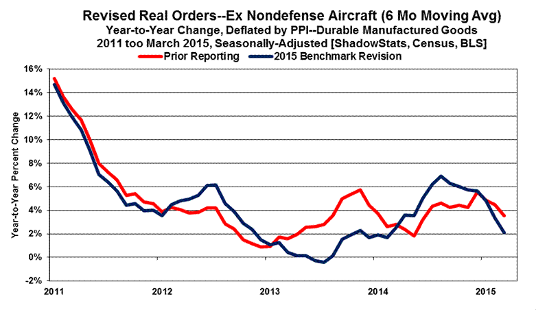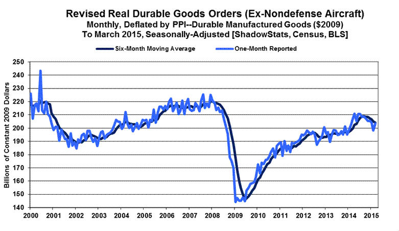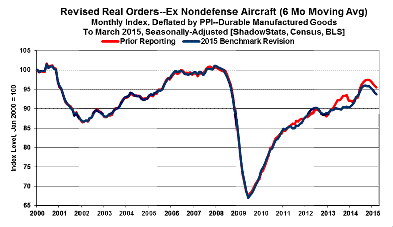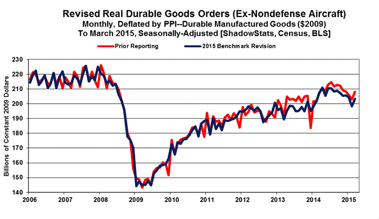 Further detail on this benchmarking will follow with the regular ShadowStats coverage of the headline April 2015 new orders for durable goods, scheduled for release on May 26th. There are unusual patterns in revisions to some of the major durable goods categories and to some non-durable goods numbers, also released, which may be indicative of some surveying and definitional issues responsible for some unusually large, revised jumps in what otherwise should have been reasonably-stable categories.