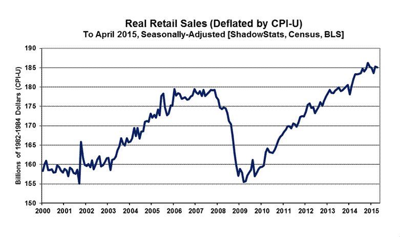 Instead of being deflated by the CPI-U, the "corrected" real retail sales numbers—in the second graph (the next graph following)—use the ShadowStats-Alternate Inflation Measure (1990-Base) for deflation. With the higher inflation of the ShadowStats measure, the revamped numbers show a pattern of plunge and stagnation and renewed downturn, consistent with patterns seen in consumer indicators like real median household income, consumer confidence, broad unemployment and in most housing statistics. A topping out in late-2011 and early-2012 reverted to renewed decline in second-quarter 2012 in this series, which had been bottom-bouncing at a low-level plateau of economic activity since the economic collapse from 2006 into 2009. The renewed contraction has trended into and deepened into the first four months of 2015, allowing for the occasional and temporary upside blips.