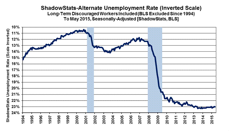 ShadowStats Measure. Adding back into the total unemployed and labor force the ShadowStats estimate of the still-growing ranks of excluded, long-term discouraged workers—more in line with common experience—broad unemployment, the May 2015 ShadowStats-Alternate Unemployment Measure, notched higher to 23.1%, versus 23.0% in April and 23.1% in March. Such was down from the 23.3% series high in 2013 (back to 1994). Again, the ShadowStats estimate generally shows the toll of long-term unemployed leaving the headline labor force.