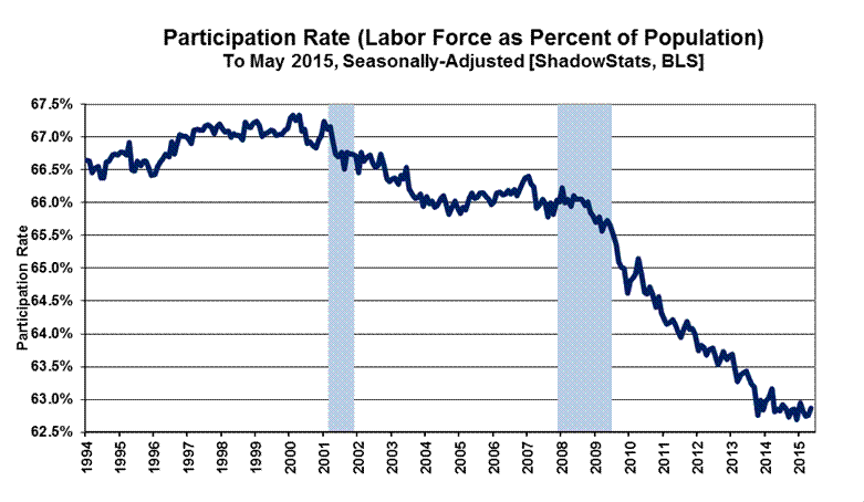 Three further related graphs, also found in the Opening Comments section, are of the ShadowStats-Alternate Unemployment Measure, with an inverted scale, the employment-to-population ratio, which has a high correlation with the inverted ShadowStats measure, and participation rate, a measure commonly touted by Federal Reserve Chair Janet Yellen.