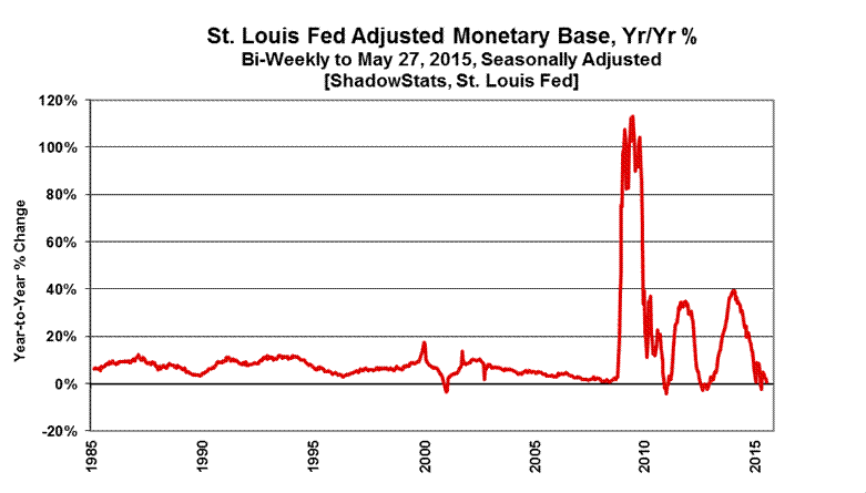 Money Supply M3 Annual Growth Tentatively Fell Back to 5.1% in May 2015. Year-to-year growth in May 2015 M3 (ShadowStats-Ongoing Measure) fell back to 5.1%, from 5.4% in April, 5.7% in March and a 68-month high of 5.8% in February 2015, then the strongest showing since June of 2009. Any revisions in the accompanying data generally reflect regular and irregular revisions by the Federal Reserve to the underlying monthly data.