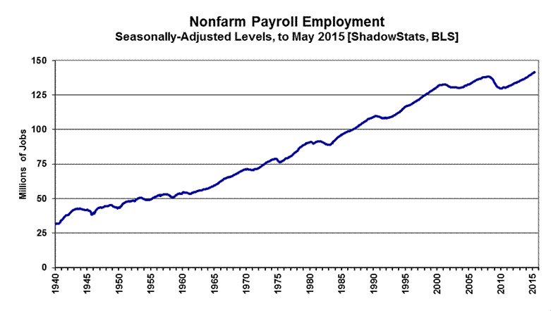 The graph immediately preceding reflects headline May 2015 U.3 unemployment at 5.51%, up from 5.44% in April; headline May U.6 unemployment at 10.79%, versus 10.83% in April; and the headline May ShadowStats unemployment measure at 23.1%, versus 23.0% in April. The ShadowStats-Alternate Unemployment series is built upon the BLS reporting of seasonally-adjusted U.3 and U.6 series, and correspondingly, is affected by the reporting and annual seasonal adjustments to those underlying series.