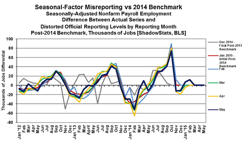 The preceding chart details how far the monthly payroll employment data have strayed from being consistent with the most recent benchmark revision. The gray line shows that December 2014 pattern versus the 2013-benchmark revision, and the color-coded lines show the January to May 2015 patterns of distortion versus the 2014-benchmark. Due to several months of testing of the model, before the benchmark release, the BLS never publishes the historical data on a consistent basis.