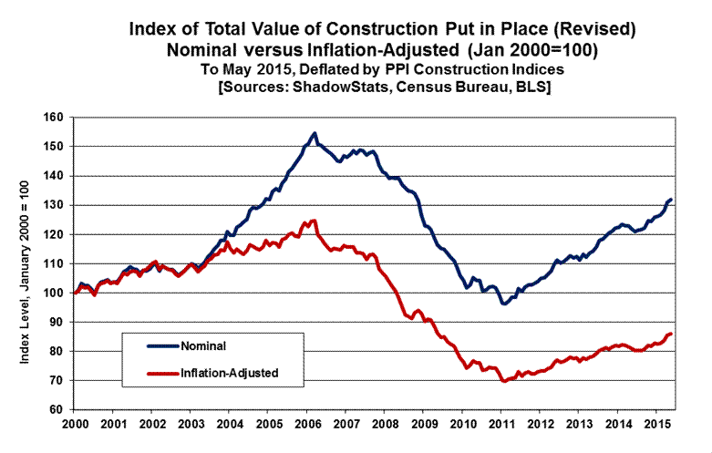 Despite the recent uptrend, the pattern of inflation-adjusted activity here—net of government inflation estimates—does not confirm the economic recovery indicated by the headline GDP series (see Commentary No. 731 and No. 692 Special Commentary: 2015 - A World Out of Balance). To the contrary, the latest construction reporting, both before (nominal) and, more prominently, after (real) inflation adjustment, shows a pattern of low-level, variable stagnation, where activity never recovered pre-recession highs.
