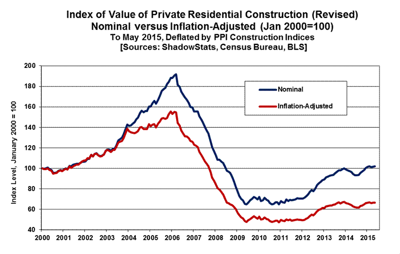 Headline construction-payroll numbers remain heavily biased to the upside (officially bloated by 6,000 jobs per month, unofficially at an order of magnitude of 20,000 jobs per month). Nonetheless, total June 2015 construction jobs were down by 17.4% (-17.4%) from the April 2006 pre-recession series peak.