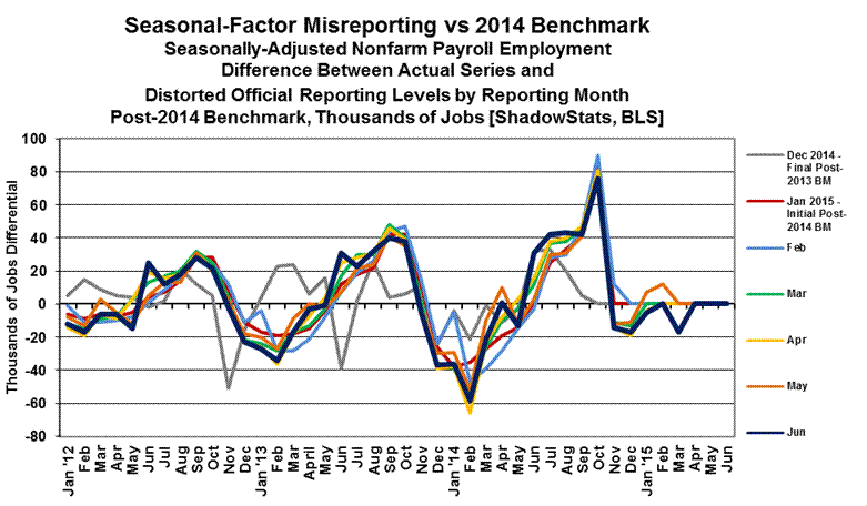 Conditions deteriorated sharply in June. Headline payroll jobs rose by 223,000 per the Bureau of Labor Statistics (BLS), but underlying reality likely was an outright monthly loss of at least 50,000 (-50,000) jobs in the headline aggregate. The headline gain came in close to consensus expectations, only due to a downside revision of 60,000 jobs in overstated May payrolls (see Payroll Reporting). Net of that revision, June payrolls rose by 163,000. Yet, even that gain was exaggerated by undisclosed, favorable shifting in seasonal factors for May and June payrolls, due to unreported inconsistencies in the historical data, as generated by BLS concurrent seasonal-factor adjustments (see Concurrent Seasonal Factor Adjustments). Allowing further for false, monthly add factors in the Birth-Death Model, in excess of 200,000 jobs, June 2015 payrolls most likely fell month-to-month (see Birth-Death Model).