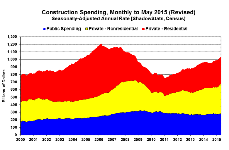 Construction-Spending Revisions Left the Real Series in Low-Level, Albeit Up-Trending Stagnation. Headline May 2015 reporting of, and the accompanying benchmark revisions to construction spending, showed somewhat stronger aggregate activity than before. Yet, there were offsetting downside revisions to residential spending, versus upside shifts to nonresidential spending, in the private sector. Nonetheless, particularly net of inflation, total construction-spending activity generally remained in low-level stagnation, never recovering from the collapse in economic activity into 2008 and 2009. The May 2015 headline gain in construction spending was, as usual, not statistically significant in this otherwise highly volatile series.