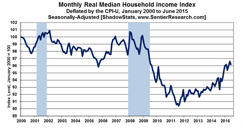 The first graph shows monthly real median household income through June 2015, as reported by www.SentierResearch.com. This measure of real (inflation-adjusted) monthly median household income turned lower in June, reflecting flat, month-to-month nominal median income hit by rising consumer inflation. A similar circumstance generated a headline plunge in second-quarter 2015 real average weekly earnings, discussed in Commentary No. 736. The income series has been in low-level stagnation, with a recent uptrend boosted by dropping gasoline prices. Where negative inflation boosts the level of real growth relative to nominal growth, recent relative "strength" in the series largely reflected temporary, gasoline-price-driven, headline month-to-month contractions in CPI-U reporting, and flat-to-minus annual inflation. That monthly inflation issue reversed in May and June reporting.
