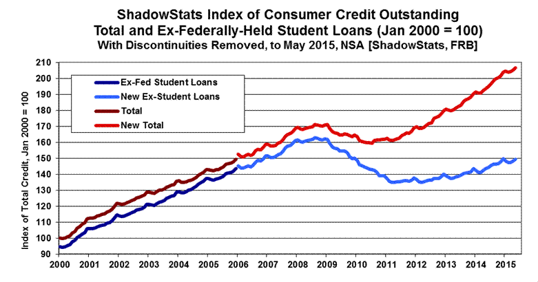 Through May 2015 reporting, the graph of monthly Consumer Credit Outstanding is a subcomponent of the prior graph on real household sector debt, but it is not adjusted for inflation. Post-2008 Panic, outstanding consumer credit has continued to be dominated by growth in federally-held student loans, not in bank loans to consumers that otherwise would fuel broad consumption growth. The nominal level of Consumer Credit Outstanding (ex-student loans) has not rebounded or recovered since the onset of the recession. These disaggregated data are available and plotted only on a not-seasonally-adjusted basis.
