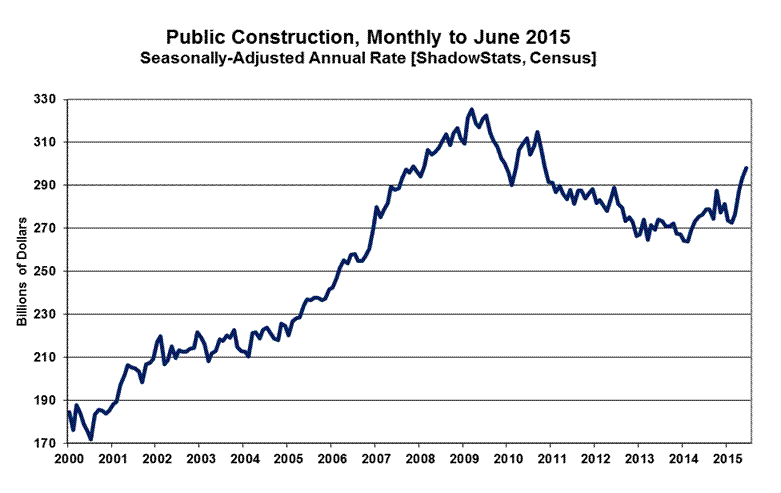 Economic Outlook Remains Bleak. In the general scope of what was described in prior Commentary No. 739 as an unfolding, multiple-dip economic collapse, the June 2015 reporting on the trade deficit and construction spending offered little new in terms of the broad outlook. Where headline June construction spending was flat, after inflation adjustment, and despite volatile, upside revisions since March, the aggregate construction series continued in a pattern of low-level but up-trending stagnation. The series still has failed to regain its pre-recession high, holding at 29% below that benchmark.