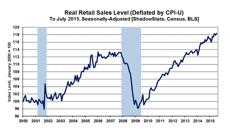 Real (Inflation-Adjusted) Retail Sales—July 2015—Monthly Nominal Growth of 0.6% Slowed to 0.4% Net of CPI-U Inflation; Recession Signal Continued. Not adjusted for inflation, headline nominal retail sales rose by 0.57% in July 2015, following an upwardly revised "unchanged" reading of 0.00% in June 2015 [previously down by 0.27% (-0.27%)], as detailed in Commentary No. 743 of August 17th. Year-to-year growth in July 2015 nominal retail sales was 2.43%, versus an upwardly revised 1.83% [previously 1.53%] annual gain in June 2015.