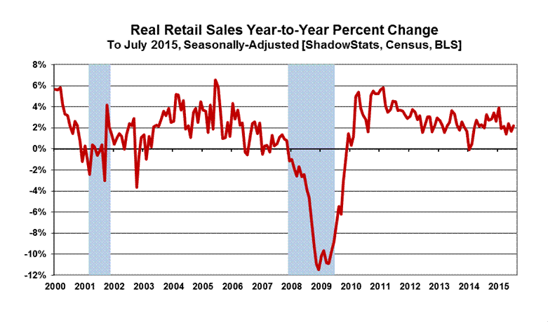 Real Retail Sales—July 2015—Recession Signal Continued. Not adjusted for inflation, headline nominal retail sales rose by 0.57% in July 2015, following an upwardly revised "unchanged" reading of 0.00% in June 2015, as detailed in Commentary No. 743. Year-to-year growth in July 2015 nominal retail sales was 2.43%, versus an upwardly revised 1.83% annual gain in June 2015.
