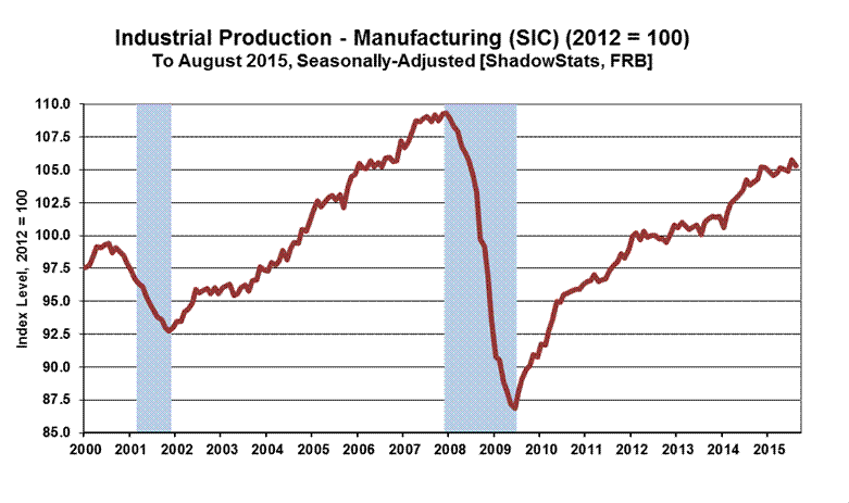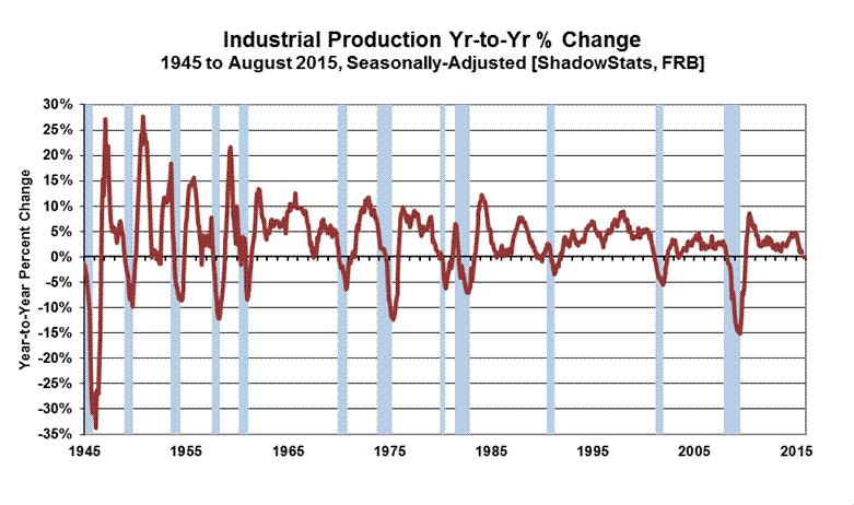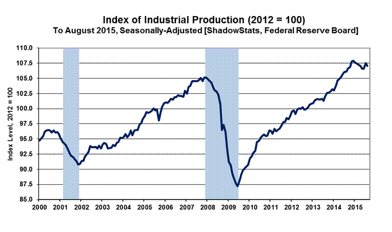 Industrial Production—August 2015—Deepening Downturn. With headline August 2015 industrial production reporting in place, the production series shows a deteriorating economic environment, a deepening and intensifying recession, with circumstances last seen in the economic collapse into 2009. Given downside revisions to recent history, annual growth in production again is at its weakest level (other than in June) since coming out of the economic collapse. August 2015 production fell month-to-month by 0.38% (-0.38%), following a revised gain of 0.87% [previously up by 0.56%] in July.