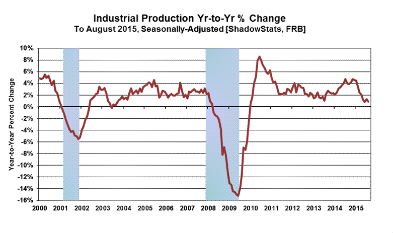 Year-to-year August 2015 production growth was 0.91%, versus a revised 1.33% in July, a downwardly-revised 0.80% (post-collapse low) in June, and a downwardly-revised 1.25% in May. Annual growth falling to these levels commonly is seen only in, or at the onset of formal recessions (see Graphs 4 and 5 in the Reporting Detail).