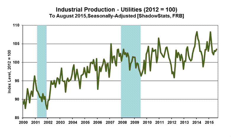 Detailed in Graphs 8 to 10 of major industry groups, the headline August 2015 monthly aggregate production loss of 0.4% (-0.4%) [a July gain of 0.9%], was composed of a decline of 0.5% (-0.5%) in August manufacturing activity [a July gain of 0.9%]; an August decline in mining of 0.6% (-0.6%) [July gain of 1.8%] (including oil and gas production); and an August gain of 0.6% in utilities [July contraction of 0.2% (-0.2%)]. Again, the effective upside revisions to July activity were due to downside revisions in June activity.