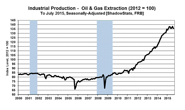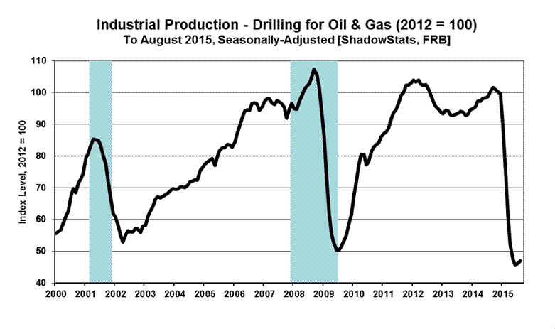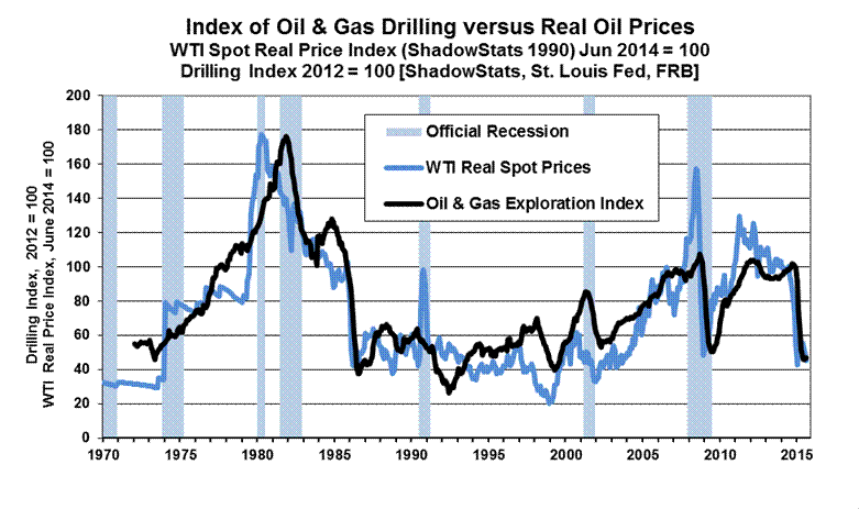 Graph 15: Mining – U.S. Drilling for Oil & Gas versus Real Oil Prices (WTI ShadowStats 1990 Base)