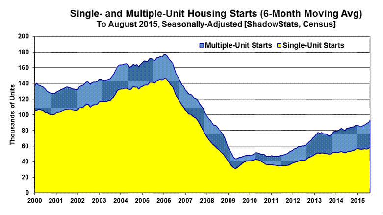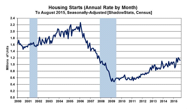 Housing Starts—August 2015—Broad Activity Continued in a Smoothed Pattern of Stagnation. The monthly detail of the aggregate housing-starts series continues to be of little meaning, other than as viewed in the context of a six-month moving average. The headline monthly decline of 3.0% (-3.0%) in August 2015 housing starts was subdued by downside revisions to July activity. The August contraction was 6.6% (-6.6%) versus the initial reporting of July 2015 activity, where consensus expectations [Bloomberg and Market Watch] had been for a headline monthly decline in August housing starts of 3.2% to 3.3% (-3.2% to -3.3%) against the initial July detail. None of those changes was or would have been statistically significant.