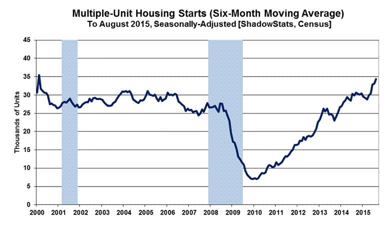 Housing starts for apartment buildings (generally 5-units-or-more) in August 2015 fell month-to-month by a statistically-insignificant 2.3% (-2.3%), versus a revised monthly decline in July of 23.5% (-23.5%) and a revised gain of 39.3% in June. The August 2015 year-to-year contraction of 24.5%, which was statistically insignificant, followed a revised annual contraction of 7.5% (-7.5%) in July 2015 and a revised annual gain of 70.2% in June 2015.