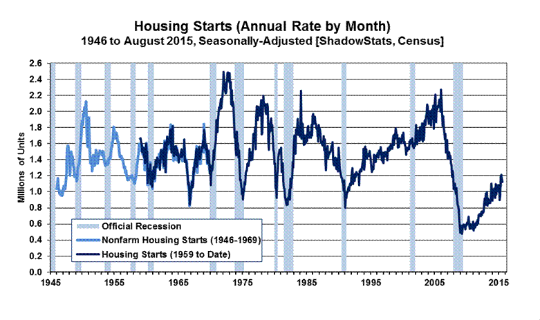 Year-to-year change in the seasonally-adjusted, aggregate August 2015 housing-starts measure was a statistically-significant gain of 16.6%, versus a revised annual gain of 6.0% in July 2015 and a revised gain of 30.6% in June 2015.