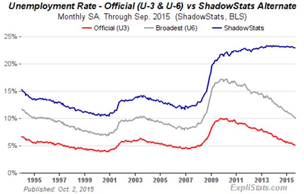 September 2015 Unemployment: 5.1% (U.3), 10.0% (U.6), 22.9% (ShadowStats)