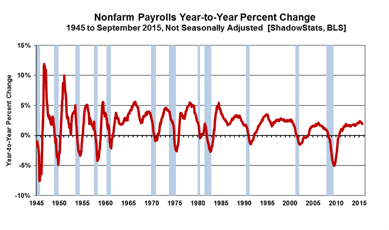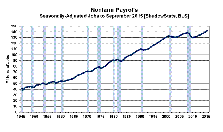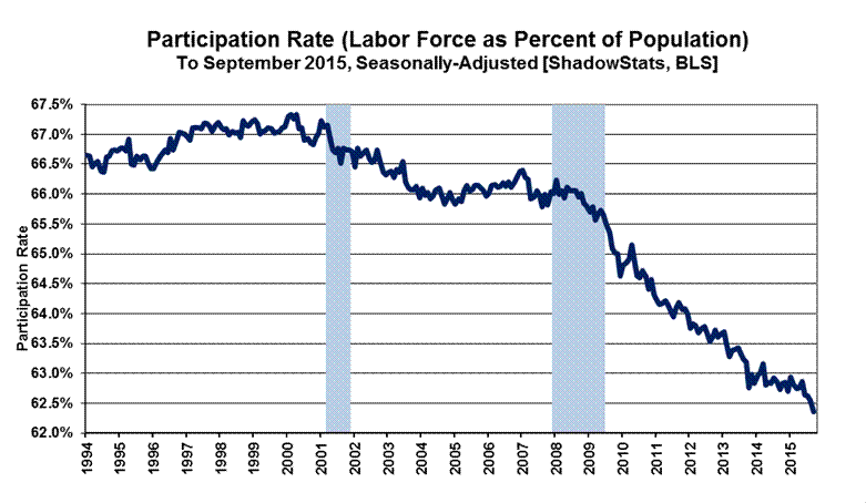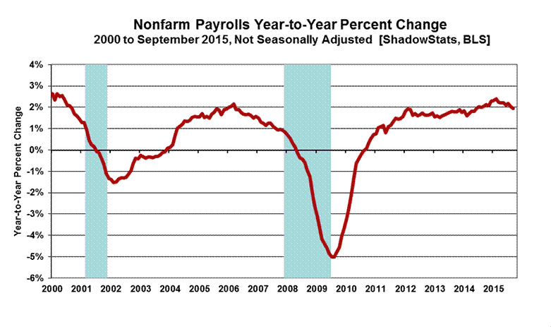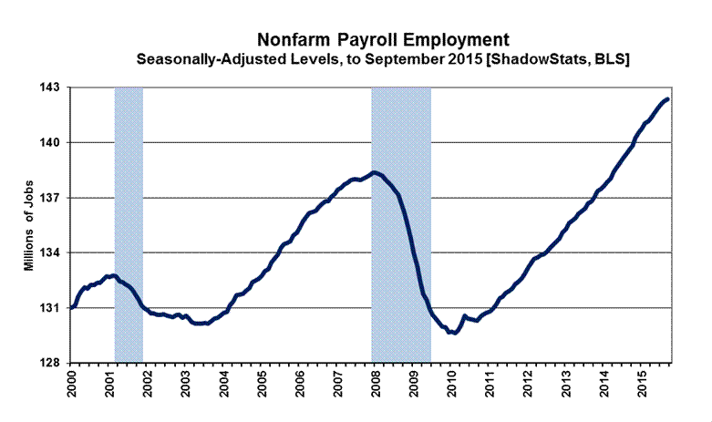Employment and Unemployment—September 2015—Headline Detail Remained Meaningless, with Weakening Payrolls and Unstable Headline Unemployment. Underlying reality for U.S. labor conditions in September 2015 remained in the realm of a 22.9% broad unemployment rate, with headline payroll employment declining month-to-month, as reviewed in the main text.