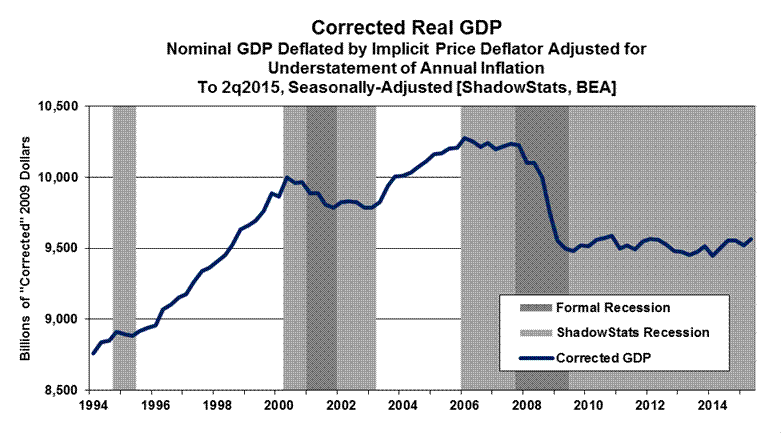 Graphs 1 through 4 reflect detail back to the 1994 redefinitions of the Household Survey. Before 1994, data consistent with September’s reporting simply are not available, irrespective of protestations to the contrary by the BLS. Separately, consider Graph 5, which shows the ShadowStats version of the GDP, also from 1994 to date, where the GDP is corrected for the understatement of inflation used in deflating that series (a detailed description and related links are found in Commentary No. 755). In particular, the general patterns of activity seen in Graphs 2 and 3 generally are mirrored in Graph 5 of the "corrected" GDP.