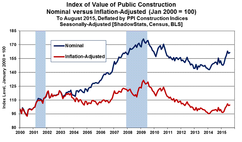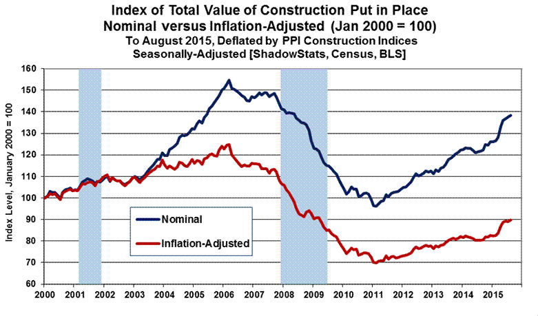 Separately, although construction-related inflation continues to spike the headline nominal numbers (month-to-month August 2015 excepted), the softened patterns of inflation-adjusted real growth still continue to run well ahead of, and are not supported by, growth in related construction employment. That suggests that the government estimates of construction inflation are too low, as generally confirmed by private surveys (see the PPI Final Demand Construction Index section).