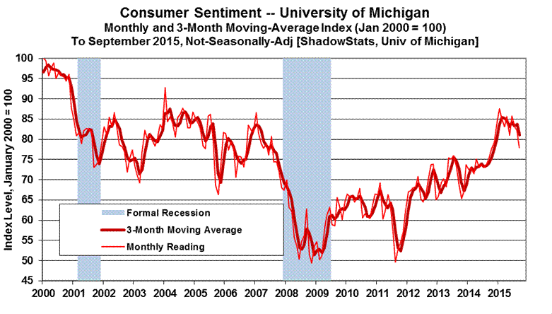 The full-September measures for the Conference Board’s Consumer-Confidence and the University of Michigan’s Consumer-Sentiment measures are shown in Graphs 11 to 13. The Conference Board’s seasonally-adjusted [unadjusted data are not available] Consumer-Confidence Index (Graph 11) and the University of Michigan’s not-seasonally-adjusted Consumer-Sentiment Index (Graph 12) for the full-month of September 2015 moved in opposite directions, with confidence up slightly and sentiment sharply lower for the month. A good case never has been made for seasonally-adjusting confidence.